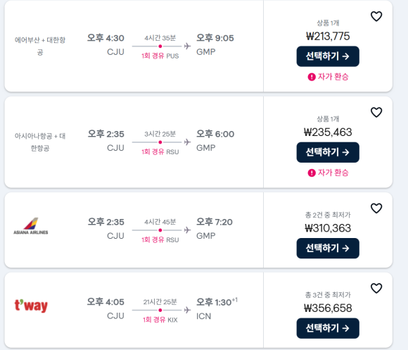 심지어 제주에서 김포 가는데, 여수에서 환승해서 4시간 걸리는 항공권도 등장해요.