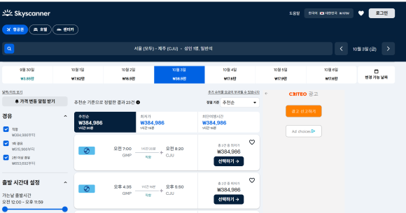 스카이스캐너에서 보이는 표들을 하나하나 클릭해봤어요.