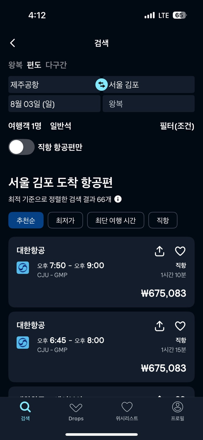 제주 -> 김포 편도가 67만원이라니. 거의 오키나와 왕복 수준