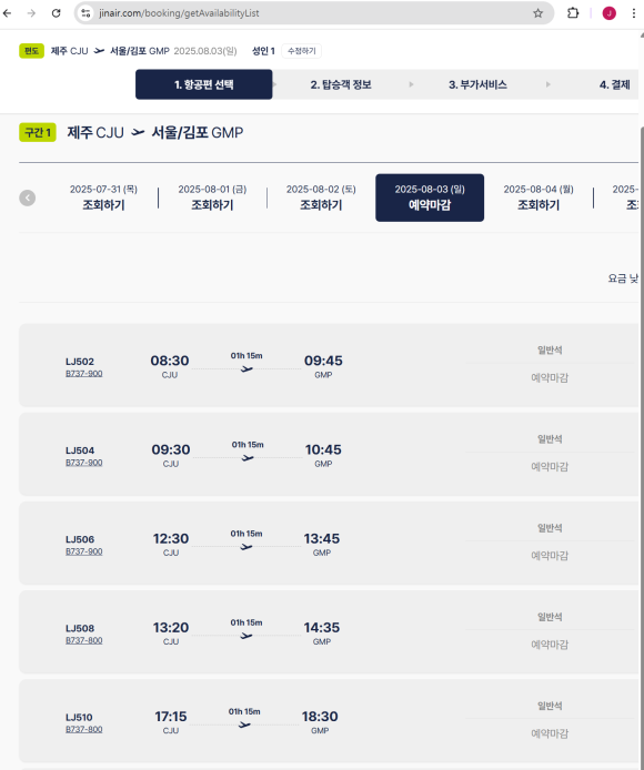 역시나 진에어 홈페이지에 가면 없고. 전부 예약마감인 것을 확인하였다.